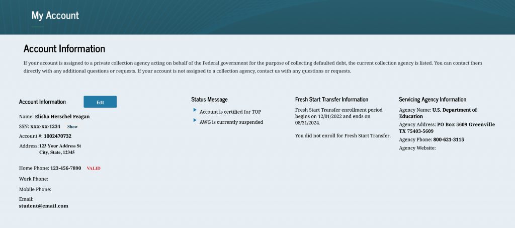 Once you log in to MyEdDebt.ed.gov, the “My Account” page will display your contact information and if you enrolled in the Fresh Start program (which ended on Oct. 2, 2024).