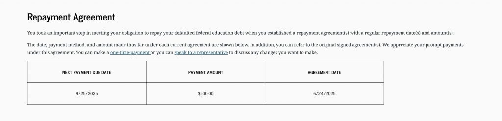 If you enter into a rehabilitation agreement or a repayment agreement, the “Repayment Agreement” section will list the start date, your next payment due date, and the amount due. You won’t be able to view the full agreement on the website. Instead, refer to the documentation you received by postal mail.