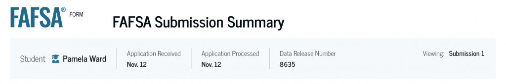 After your FAFSA form is submitted and processed, you can find the FAFSA Submission Summary on the Dashboard of your StudentAid.gov account. You’ll also see the date your application was received and processed.