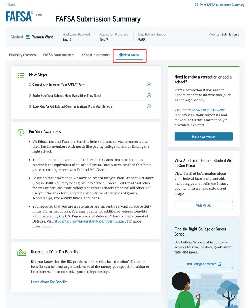 The FAFSA Submission Summary not only gives you information that can help you prepare to pay for school but also alerts you to any issues with your FAFSA form or selected schools, allows you to make corrections, and provides additional resources to help you plan.
