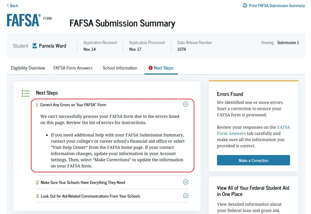 If we found errors on your FAFSA form, you will see an “Errors Found” box that provides information and a link for you to “Make a Correction.”