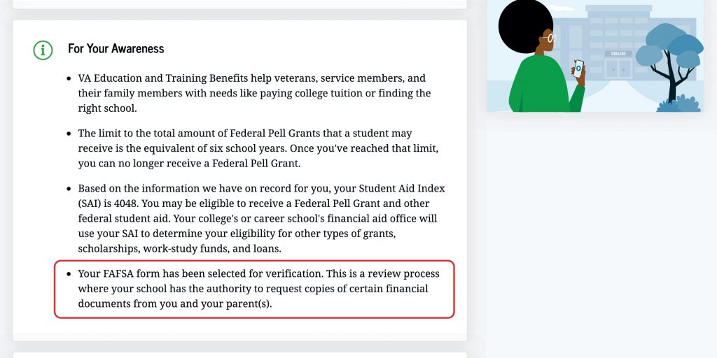 On the “Next Steps” tab of your FAFSA Submission Summary, you can check if you’ve been selected for verification of your aid eligibility.