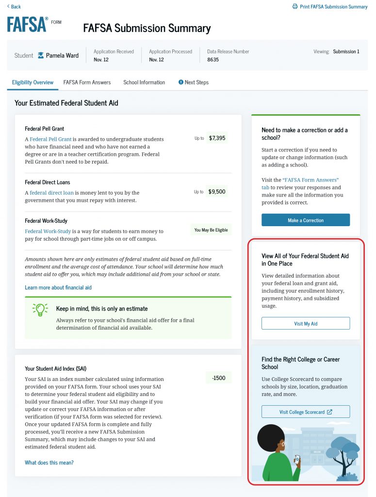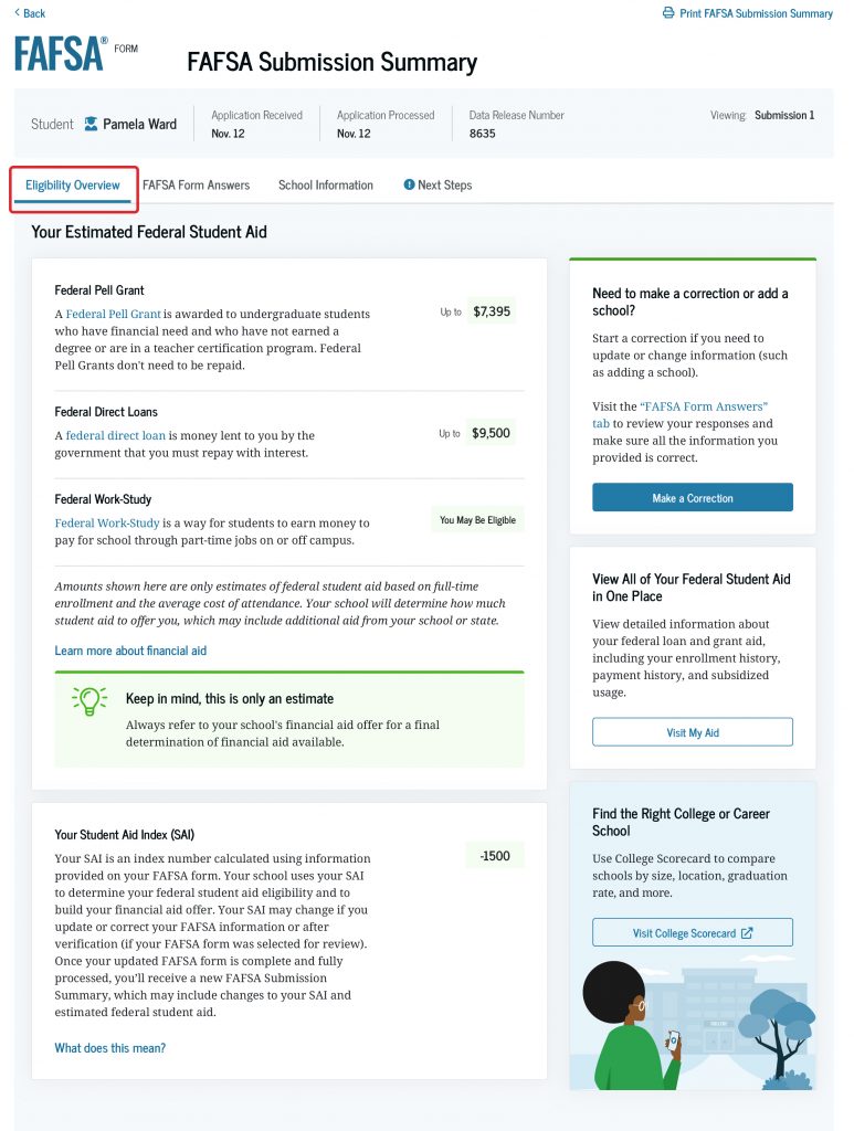 The “Eligibility Overview” tab on the FAFSA Submission Summary provides important information that can help you understand the aid you may receive from your school. This includes money you don’t have to repay (such as a Federal Pell Grant), money you can earn from working at your school (Federal Work-Study), and federal student loans.
