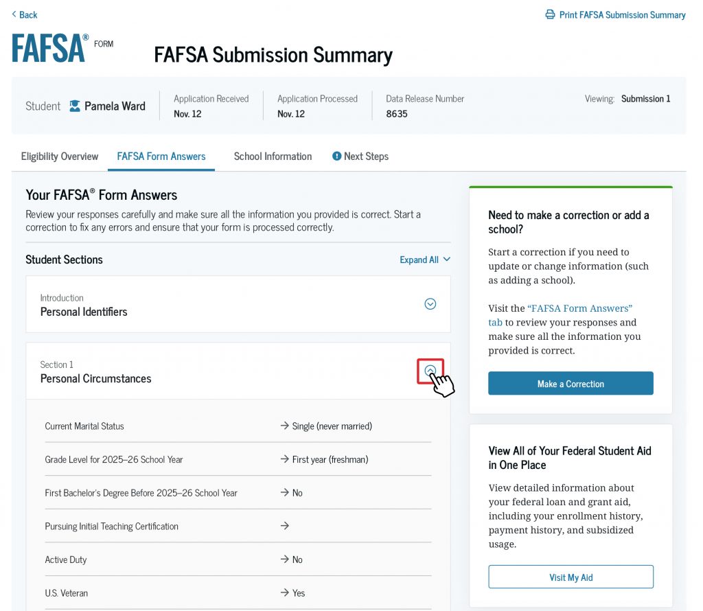 On the “FAFSA Form Answers” tab of your FAFSA Submission Summary, you’ll see the answers you and your contributor(s) provided on your FAFSA form. Select the down arrow to expand each section and review the answers for accuracy.