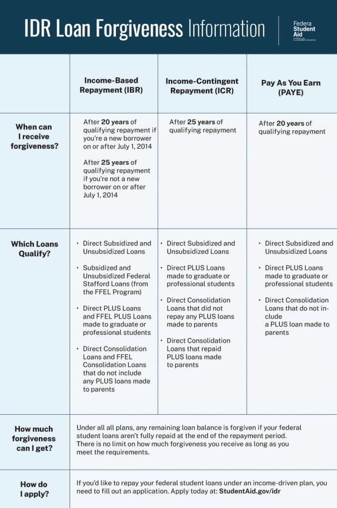 An IDR plan bases your monthly payment on your income and family size. If you repay your loans under an IDR plan, the end of term balance on your student loans may be forgiven after you make a certain number of payments over 20 or 25 years (240 or 300 monthly payments).